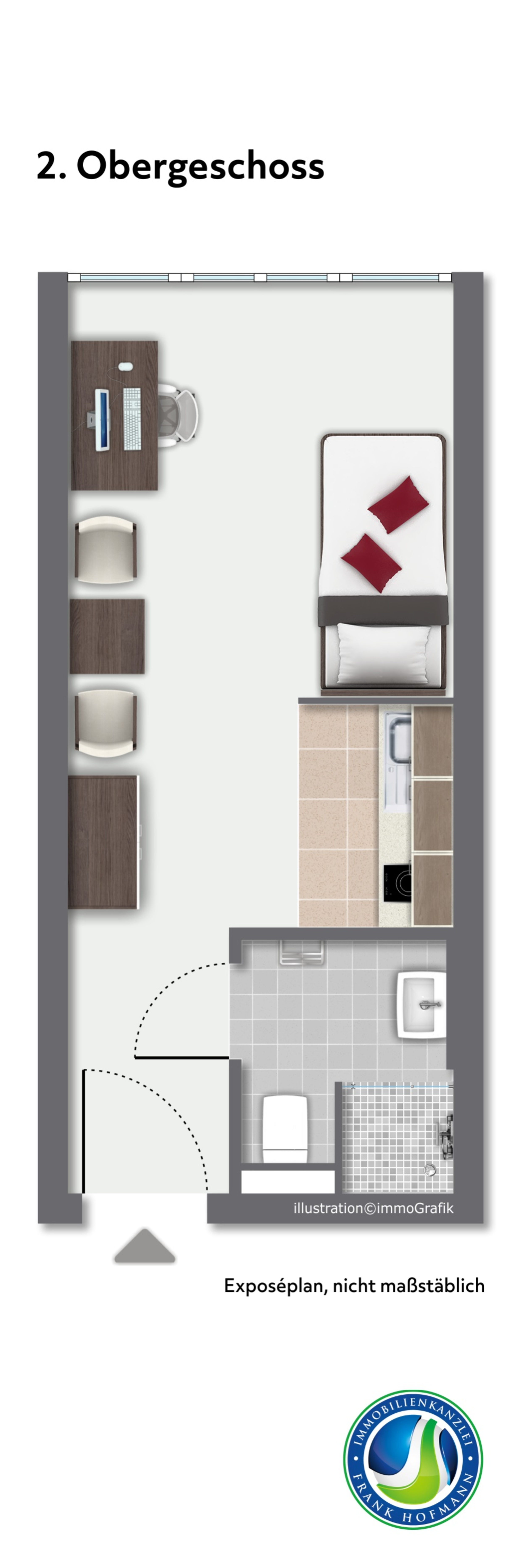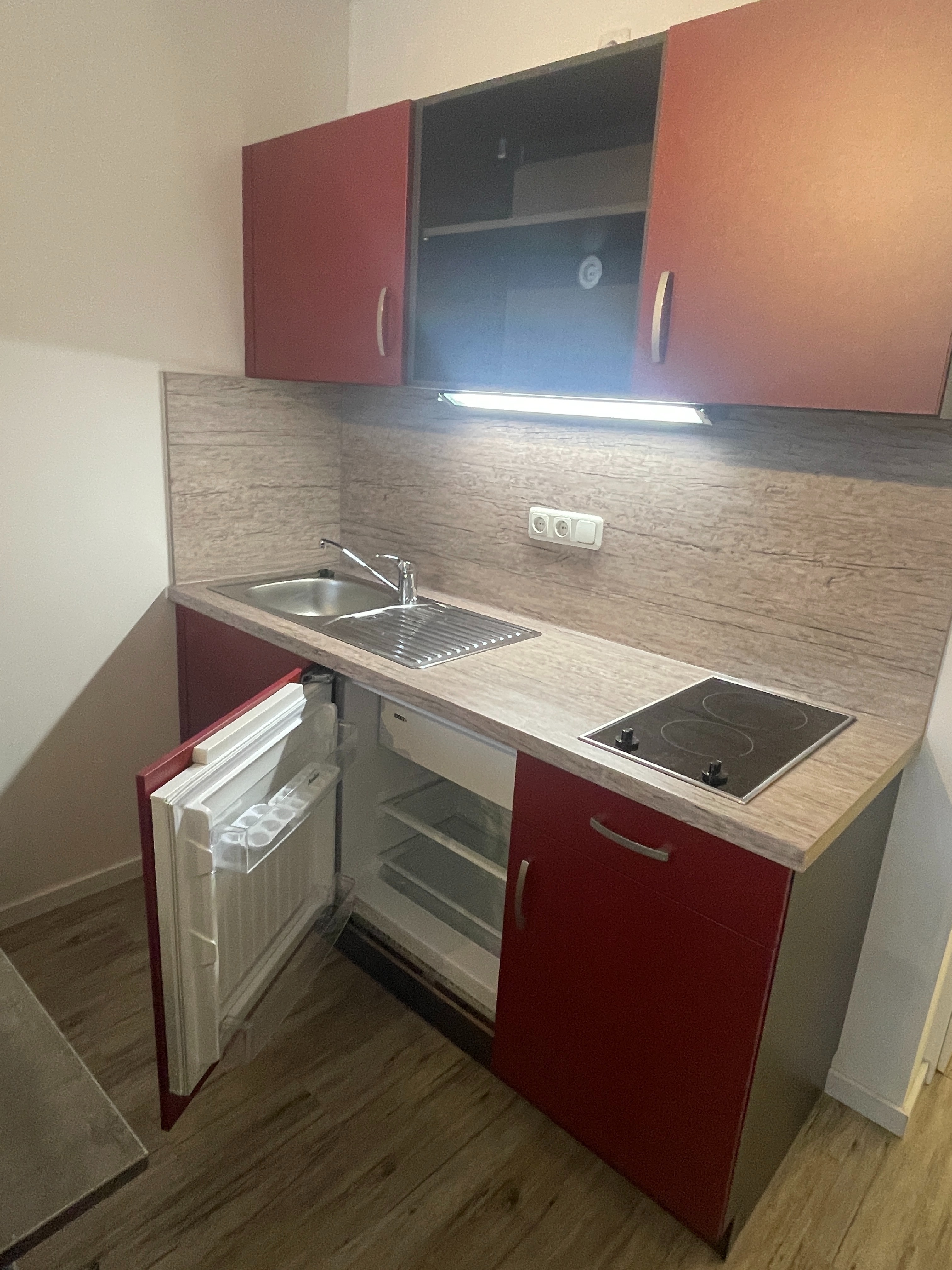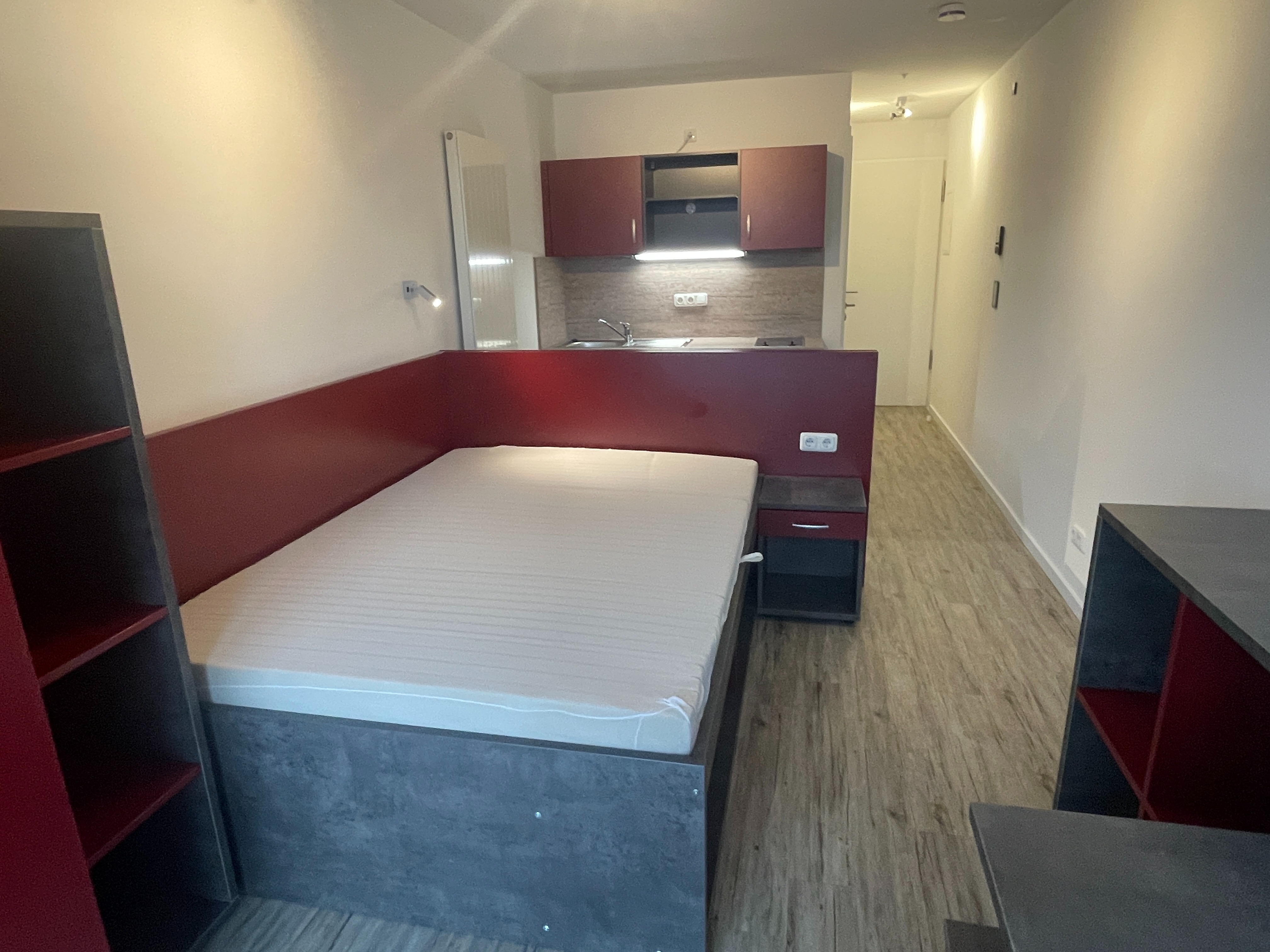 Das Appartement besteht aus einem Zimmer mit raumhohen Fenster mit elektrischen Rollläden und einem Bussystem mit elektr. Zugangskontrolle. Dank der intelligenten Raumaufteilung und der Möblierung bietet der Wohnraum genügend Platz für Wohn- und Schlafbereich. Das große Fenster sorgt für ausreichend Tageslicht und schaffen eine angenehme Atmosphäre. Durch den französischen Balkon und die große Öffnung entsteht eine Art "Balkongefühl". Die Ausstattung und das stilvolle Design schaffen eine gemütliche Wohnatmosphäre.