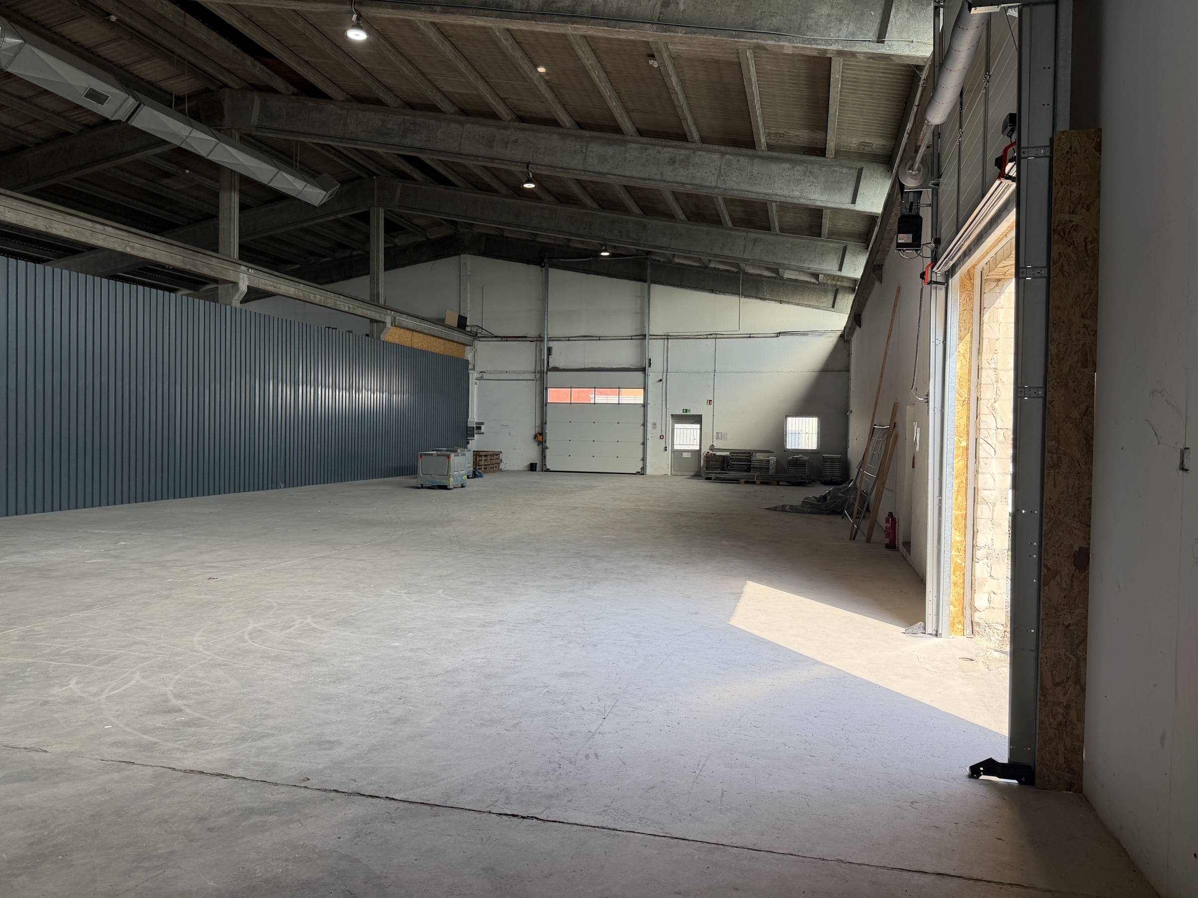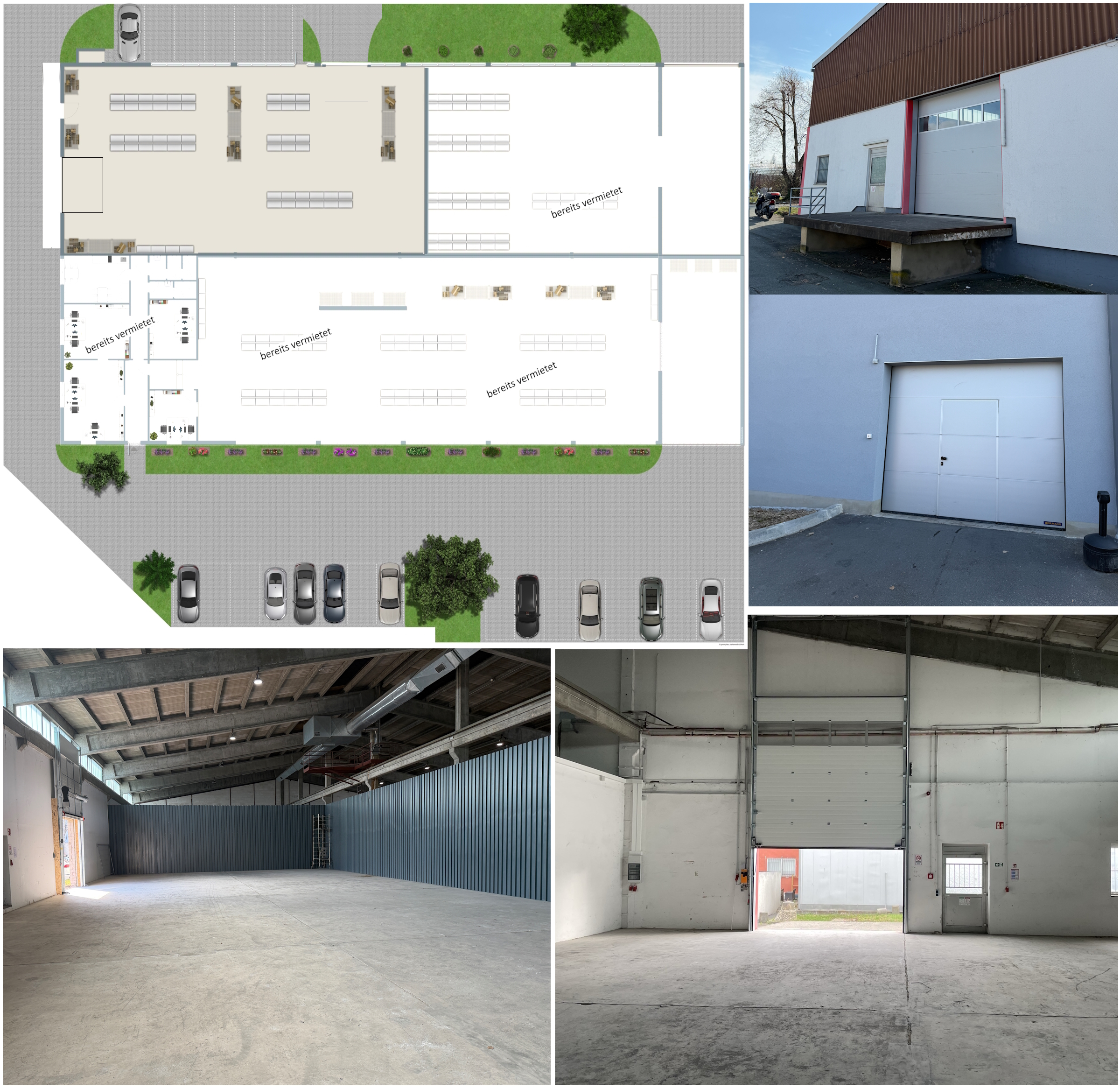 LED-Elektroausstattung, 2 elektrische Rolltore, keine Heizung, bis zu 4 KFZ-Stellplätze optional.